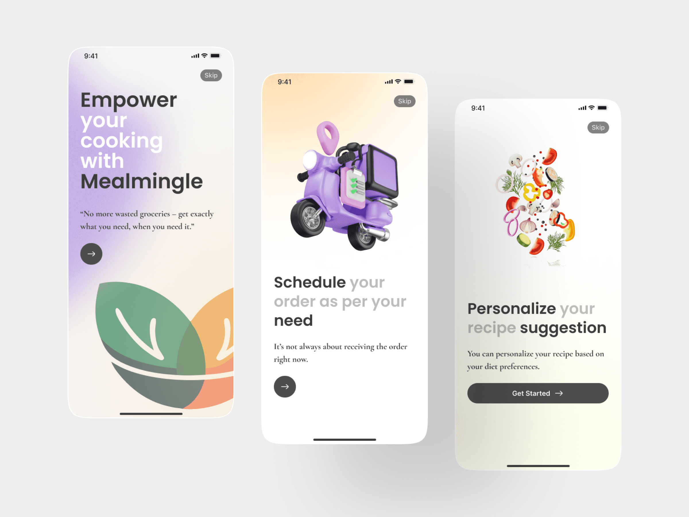 These onboarding screens introduce users to MealMingle’s core value propositions—no wasted groceries, scheduled deliveries, and personalized recipes. The visuals are intentionally simple, engaging, and comforting, reflecting the brand's promise: make cooking accessible and enjoyable for everyone. Key Goals: - Educate users about the app’s unique offerings - Build trust with a smooth first impression - Encourage quick engagement with a “Get Started” CTA