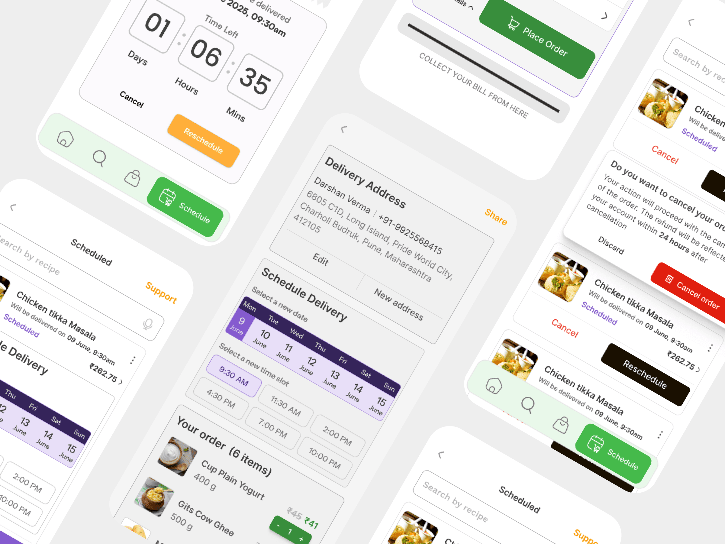 These screens focus on the delivery scheduling feature—a key differentiator. Users can choose exact time slots, reschedule orders, and cancel if needed. This flexibility ensures users don’t feel rushed and aligns with the idea of cooking at one’s convenience. Features: - Visual countdown timer for delivery - Calendar-based time slot selection - Clear cancellation and refund process UI